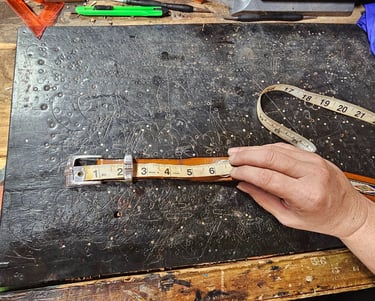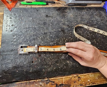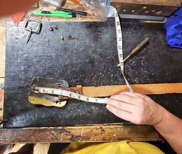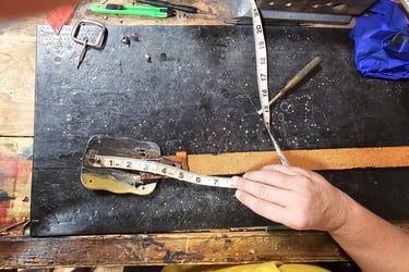 Take your favorite belt, lay it flat, and measure from the end of the prong on the buckle (for a standard buckle or the prong attached to the back of a western buckle) along the contour of the belt to the hole that you normally use. If your belt has developed a "V" shape through the years, measure along the top of the belt, don't shortcut the "V". The number you come up with will probably be different than what you think it should be, probably bigger (I never thought it would be 36 for me!), but the belt size you get in a shop is different from the actual length (my belt size was a 34, but the measurement was 36). It depends on where they measure to (which hole).