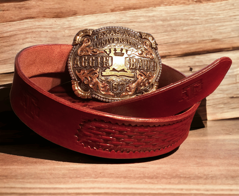 Our belts are hand crafted by a former member of the Fightin' Texas Aggie Band, Class of '87 in The Woodlands, Texas. These belts are made to match with our buckles, so are longer than a normal belt and should last a lifetime, or at least as long as you watch what you eat.